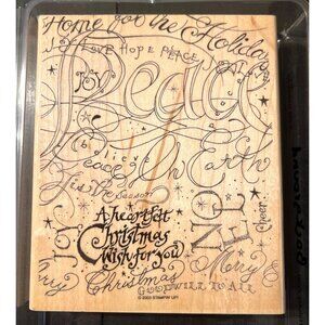This Stampin' Up! rubber stamp features an intricate "Peace On Earth" design, ideal for creating festive holiday cards and crafts. The high-quality rubber ensures clear and consistent impressions, making it a reliable tool for avid crafters and scrapbookers. Its large size covers backgrounds efficiently, adding a touch of elegance to your projects.