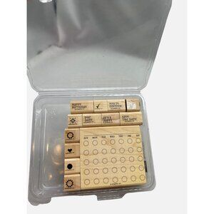 This set of 13 wood-mounted rubber stamps by Stampin Up is perfect for creating personalized invites and party decorations. Ideal for marking dates, baby announcements, and more, these stamps offer versatility and creativity for any occasion.
