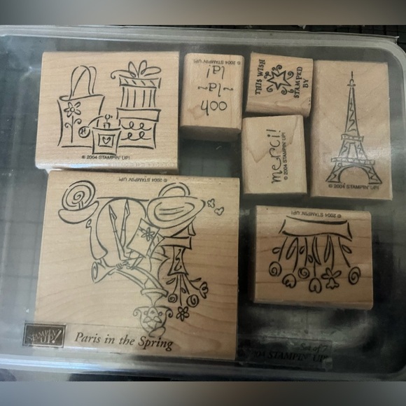 Charming Stampin' Up! set with Parisian designs. Includes Eiffel Tower and floral motifs.