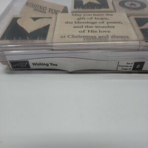 Set of six wood rubber stamps from the brand Stampin' Up! The WISHING YOU set includes stamps with the themes of wishes, peace, and love. These stamps are perfect for any crafting project, whether it be card making or scrapbooking.