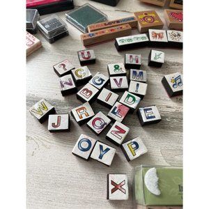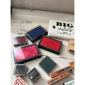 Stamps and ink pads, large lot. Includes one xtra large ink pad, 3 large ink pads, 2 medium ink pads, and 3 small ink paddle. 2 large stamps. 3 medium stamps. 24 small stamps. 24 letter and exclamation stamps. 14 vintage 1987 geometric shapes stamps. New box of 30 letter and exclamation stamps. All good pre-owned condition.