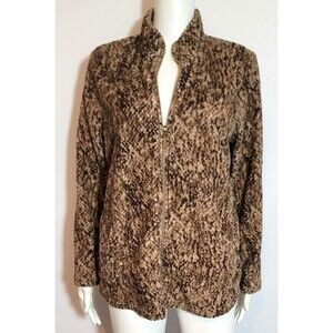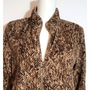 Stan Herman brown multi-color fuzzy polar fleece zip up jacket size medium. Long sleeves, rounded hem, super soft. Two hip pockets. Flat collar. Full bronzed zipper. Straight fit. Excellent condition.
