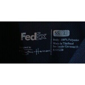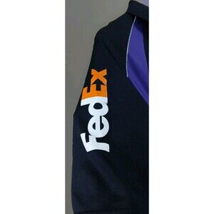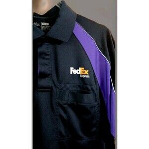Designer Stan Herman utility polo shirt in black and purple color block. Originally produced for corporate delivery staff uniforms and similar in style to those worn by FedEx couriers now worn today as courier-core streetwear and workwear fashion.