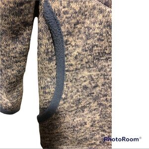 Fabric is a flecked pattern with shades of denim blue, gray and white