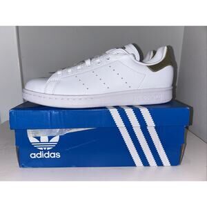 The product is a pair of Adidas Stan Smith sneakers in size 8 for women. These white sneakers feature a low top style with a lace-up closure, making them perfect for casual occasions. Made with leather, these athletic shoes from the adidas Stan Smith product line are suitable for all seasons and come in a new box. The subtle gold accents add a touch of style to these classic sneakers, making them a must-have addition to any woman's shoe collection.