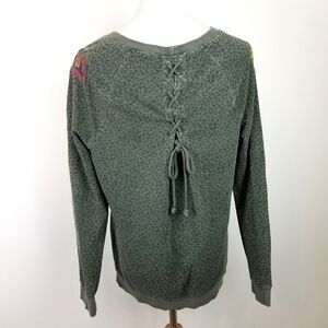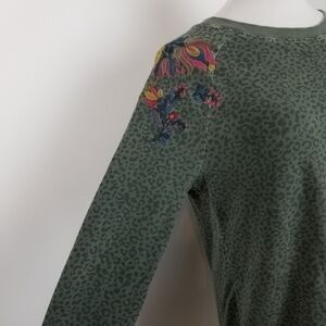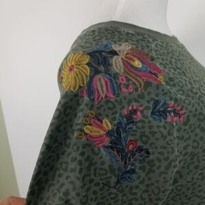 Standard Grace green cheetah print sweatshirt with beautiful embroidered flowers on both shoulders, 95% cotton, 5% spandex, EUC