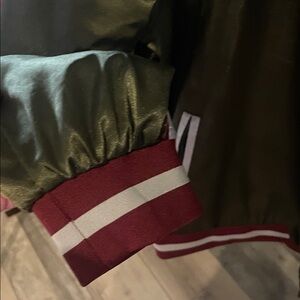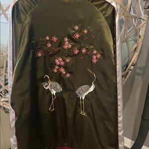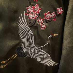 Chic green bomber jacket with bird and floral embroidery. Features red and white accents. Ideal for a stylish look.