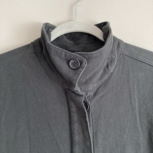 Standard James Perse Jacket Womens US XL Black Utility Field Coat Cinched Waist. Standard James Perse womens utility jacket. Mock neck. Button front closure. Long sleeves. Cinched waist with drawstring. Front pockets with flaps. 100% cotton. Black. Size 4 - XL. Measured laying flat: 21 inches from pit to pit, 26 inches long. *** Fabric lightly faded along cinched waist and some seams.
