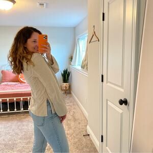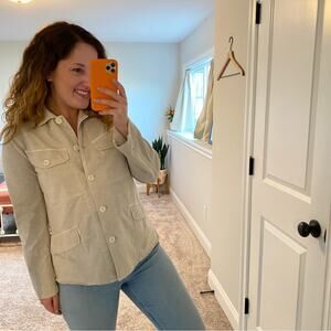 I am so in love with this super pretty high end designer Standard James Perse cotton oatmeal colored neutral distressed button front jacket/shirt/button front