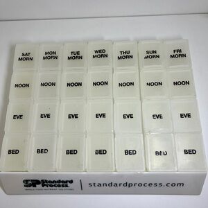 White weekly pill organizer with labeled compartments. Perfect for daily medication management.