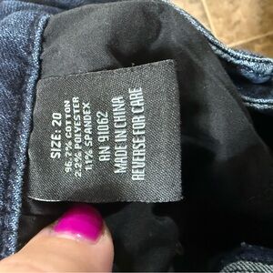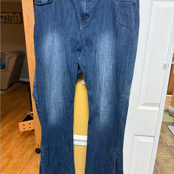Plus Size Stretch High-Waist Slit Hem Jeans. Stretch and dark rinse. Excellent condition but the tear on the logo on the back of jeans seen in the photo