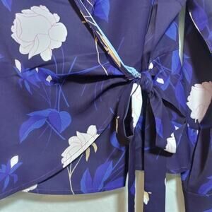Elegant floral wrap blouse featuring a beautiful blue and white design.