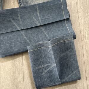 These Standards & Practices jeans are in a size 5 and have a flared leg style with a 37-inch inseam, giving off a vintage vibe. Made of a denim fabric with a medium wash, they feature a 5-pocket design with a coin pocket and come in a classic blue color. The closure includes both a zip and button, while the rise is low and the leg opening is 11 inches across. These women's jeans are designed for regular fit and are suitable for all seasons. Recently dry cleaned and starched
