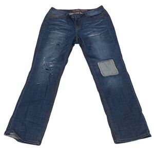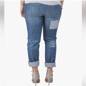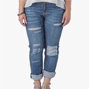 This beautiful vintage inspired boyfriend cut jean was carefully crafted for an authentic look. Light sanding and patched tears on the stretch denim give an antique worn in look.