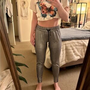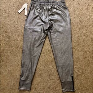 Elevate your wardrobe with these silver pants. Perfect for any occasion, they offer both comfort and style. Has pockets and ties in the front. Zippers on the sides of each leg.