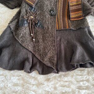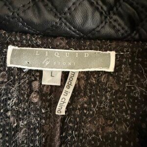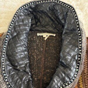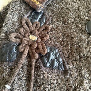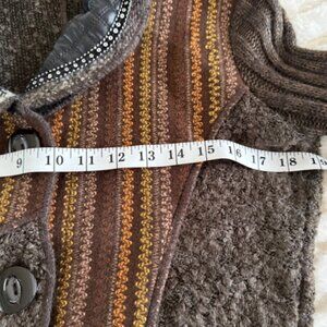 Standout Sweater! Cardigan Size Large Browns and Golds Rhinestone, Faux Leather