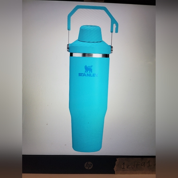 Durable Stanley 30 oz. travel mug in bright turquoise, called Splash, to keep you hydrated, and equipped with a sturdy handle and secure lid.