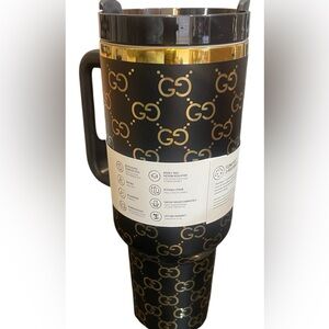 Stanley tumbler in black and gold. Features iconic pattern and Stanley branding. Comes with straw Perfect for hydration on the go.