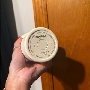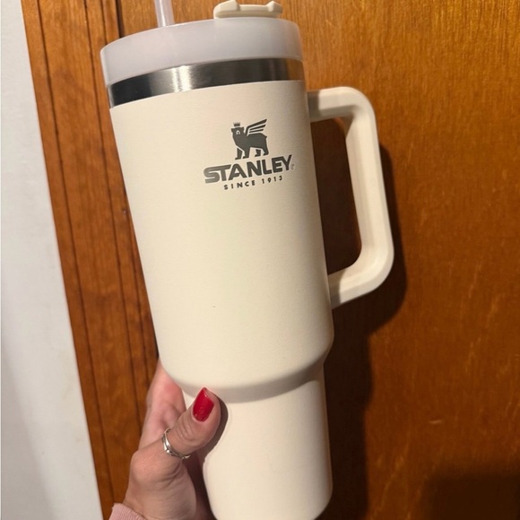 Stylish Stanley tumbler with a sturdy handle, lid, and straw. Ideal for drinks on the go.