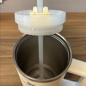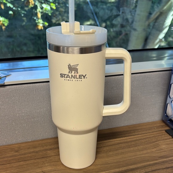 Sleek Stanley tumbler for beverages. 40oz with straw. There are a few light red marks on outside of bottle. Easy to carry with handle. Ideal for travel.