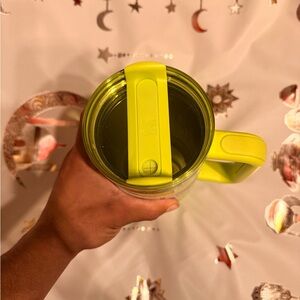 Vibrant lime green Stanley mug. Features a sturdy handle. Ideal for travel and daily use.