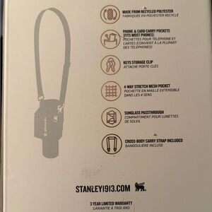 Premium bottle holder with versatile storage features. Includes phone pocket, key clip, and mesh compartment. Features sunglasses storage and cross-body strap. Made from recycled polyester material.