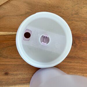 Stanley Adventure Quencher 40 oz tumbler in soft lilac. Made from durable stainless steel with double-wall vacuum insulation to keep drinks hot or cold for hours. Includes the original lid and reusable straw. Features a sturdy handle and fits most car cup holders. A few minor lighter spots on the side (shown in photos).