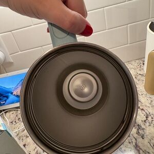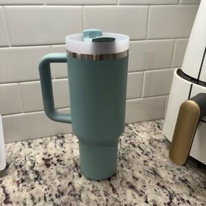 Aqua Stanley mug with a durable handle. Features a secure lid for spill prevention.