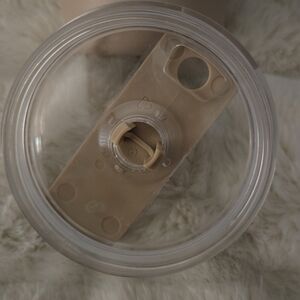 Stanley tumbler in beige with a sturdy handle. Perfect for drinks on the go.