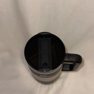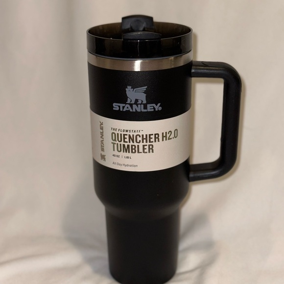 Sleek black Stanley tumbler. Ideal for keeping drinks hot or cold.