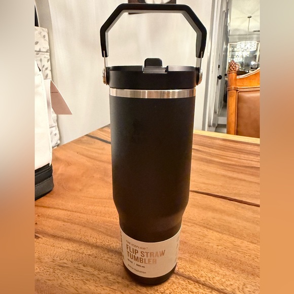 Stylish black tumbler with a flip straw. Ideal for any beverage.