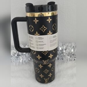 Elegant Stanley tumbler with gold LV design on black. Ideal for hydration.