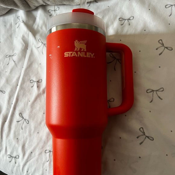 Stanley insulated travel mug in vibrant red. Features a sturdy handle and secure lid. SMOKE FREE HOME. COMES WASHED. Imperfections pictured
