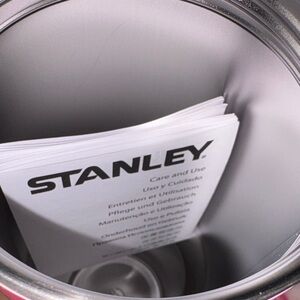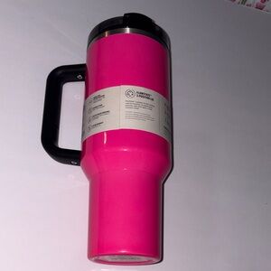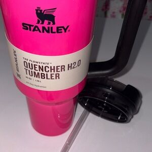 Bold pink Stanley tumbler with handle and straw. Perfect for hydration.