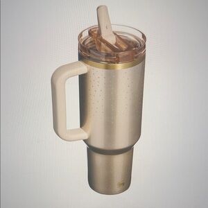 Elegant Stanley tumbler in metallic gold. Features a sturdy handle for easy carrying.