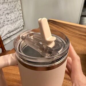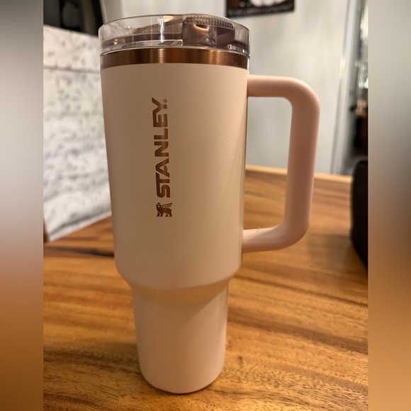 Elegant Stanley tumbler in beige. Comes with a sturdy handle.