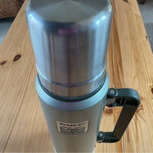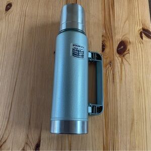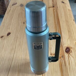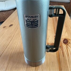 Stanley stainless steel 1.4 qt / 1.32 liter thermos bottle - with 100 year badging. It appears unused or in as new condition. It measures 14.5 inches long, 3 3/4” at the base, and 2 inches wide at the mouth.
