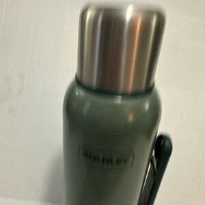 Iconic Stanley thermos in classic hammertone green. Features double-wall vacuum insulation to keep drinks hot or cold for hours. Includes original insulated stainless steel cup and folding carry handle. Durable stainless steel construction built for camping, work, hunting, or travel.
