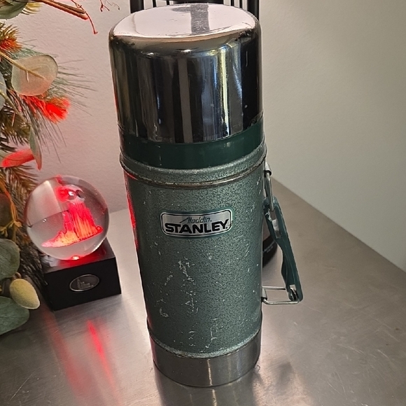 Robust Stanley flask in green and silver. Perfect for outdoor adventures.