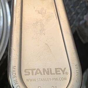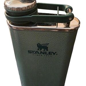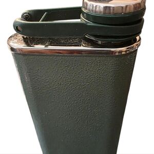 Durable Stanley flask with a rugged olive green texture. Ideal for outdoor use.
