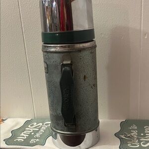 Durable Stanley thermos with a classic silver and green look. Ideal for keeping drinks at the right temperature. This is clearly a vintage Stanley thermos and is still very functional for everyday use! It is a perfect collectors item!