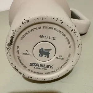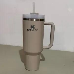 Durable Stanley travel mug. Features a sturdy handle. Ideal for beverages on the go.