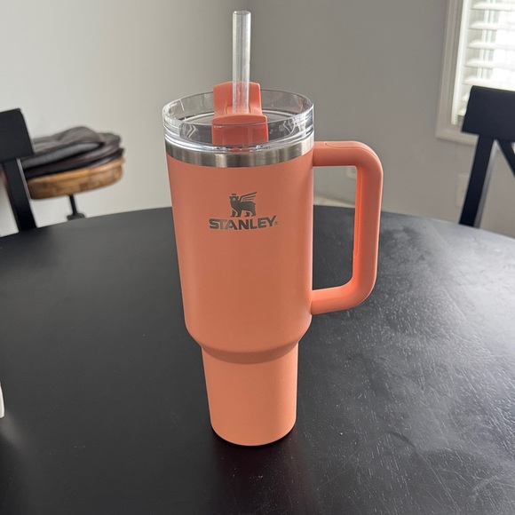 Coral Stanley mug with a clear lid and straw. Ideal for on-the-go hydration. 40 oz