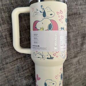 Stanley travel mug in cream with pink heart design. Features a sturdy handle and lid.