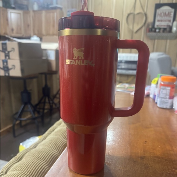 Crimson travel mug featuring a sturdy handle. Displays the Stanley logo prominently.