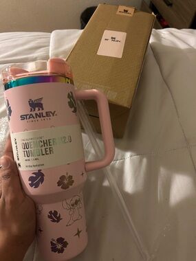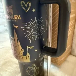 Stanley travel mug featuring iridescent Disney castle, friends and fireworks artwork. Secure lid and large handle for easy carrying. Durable stainless design for daily use. Brand new in box with straw.