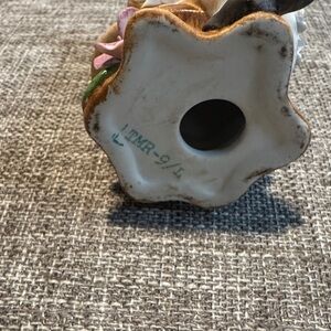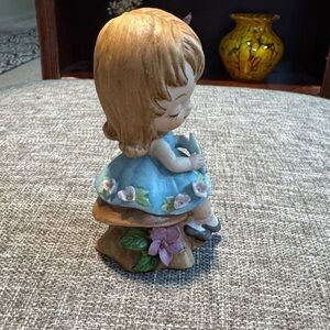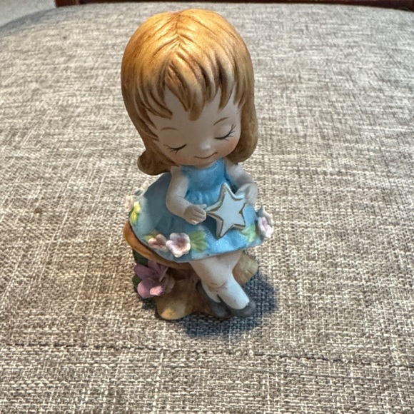 This is a vintage ceramic or porcelain bisque figurine of a little girl Charming figurine vintage Napcoware "Bloomer Girl" figurine, potentially from the 1950s or 1960s, featuring a young girl in a blue dress holding a star.
