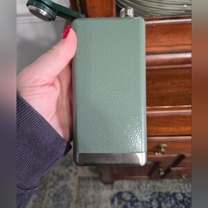 Moss green stainless steel flask. Never used. Narrow build so can fit into a shirt or coat pocket easily for quick access to a nip of something special!