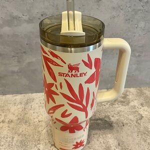 Stylish Stanley tumbler with floral red and white design. Ideal for keeping drinks hot or cold.