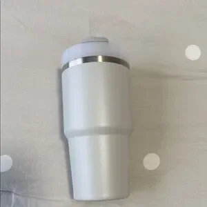 Double-wall insulated tumbler for hot and cold drinks. Includes screw-on lid and reusable straw. Stainless steel rim for durability. Easy to grip design. Light blue finish with light blue brand logo.